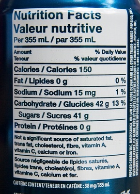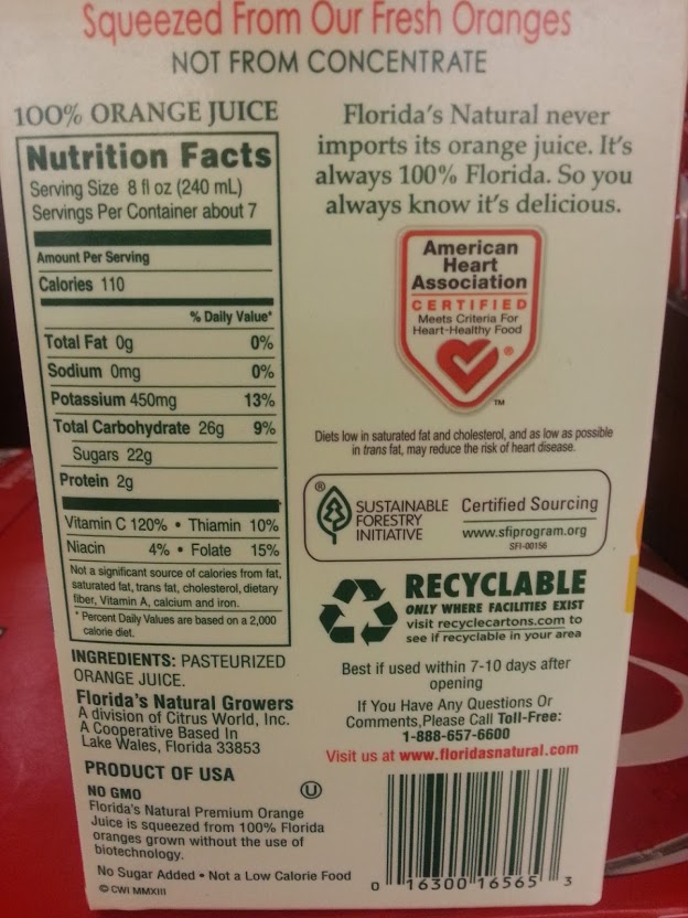 You say “But wait Tim, you’re completely wrong. Tropicana has only 22 grams of sugar per serving while Pepsi has a whopping 40 grams”. Even if I assumed you were a master at pouring exactly one serving of juice, which you are not, if you look closely at the labels you can see that 1 serving of Pepsi is 355 millilitres while one serving of Tropicana is only 240 millilitres. We need to do some math to be able to compare the two. Since millilitres is volume, and volume is comparable between two different substances (unlike mass), all we need to do is calculate what percentage the volume of the Tropicana serving is of the volume of the Pepsi serving and divide the grams of sugar in the Tropicana by that amount. While this may seem complicated, I’ve done the heavy lifting and got you covered.